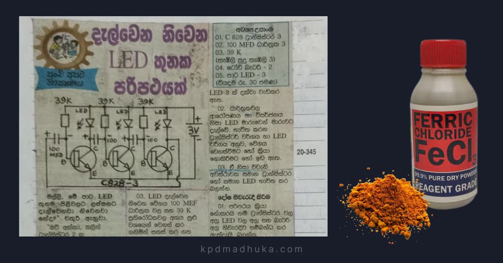 As I grew older and my understanding deepened, I was ready to tackle something more challenging. The memory of creating my first homemade PCB (Printed Circuit Board) using ferric chloride still fills me with pride. I had discovered a circuit design in the “Punchi Apata Thakshanaya” by Sarath Ananda Alwis, a column of Wijaya magazine, a publication that became my trusted companion and teacher during those formative years. The magazine’s simple yet effective circuit diagrams were perfectly suited for young enthusiasts like myself.